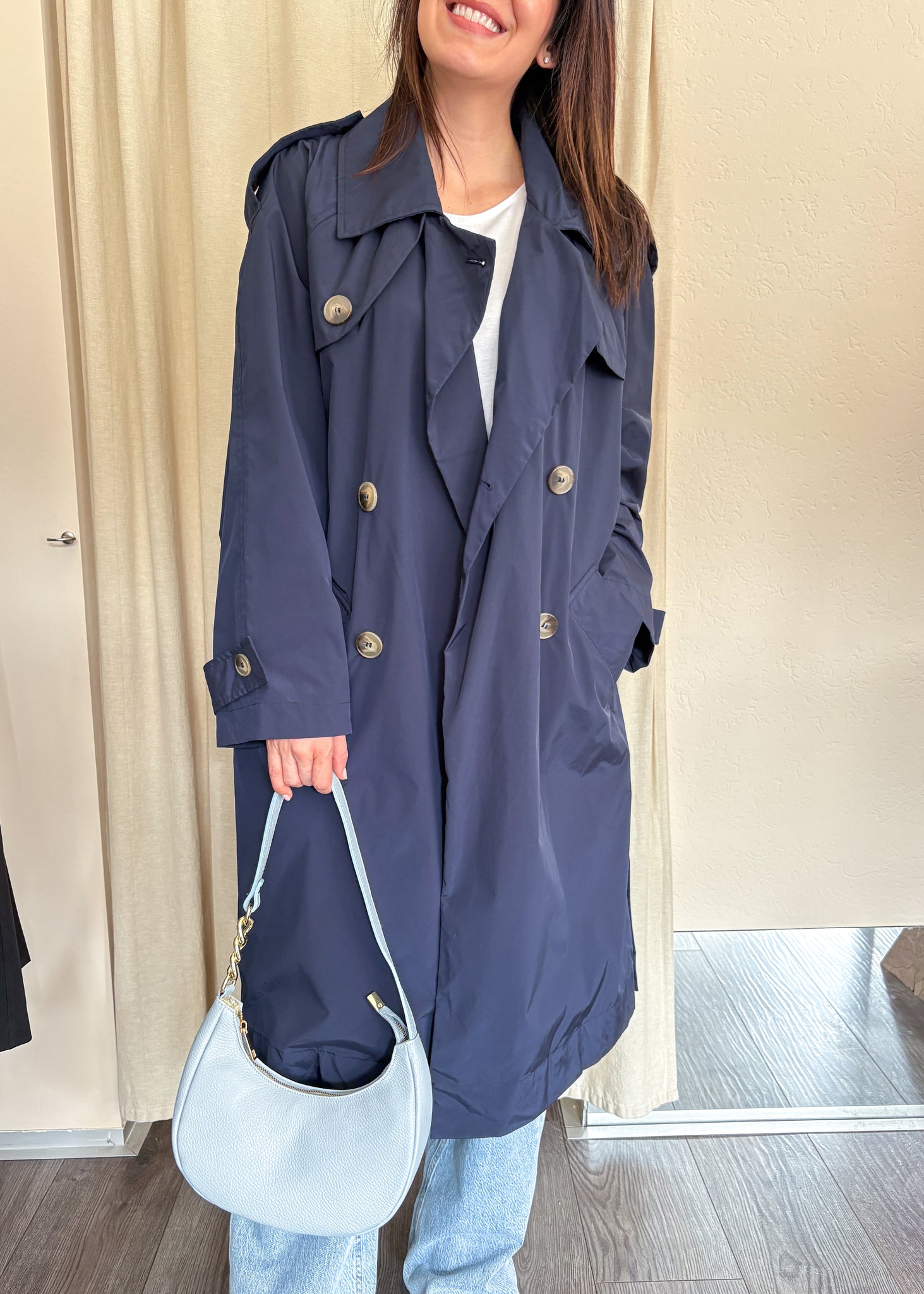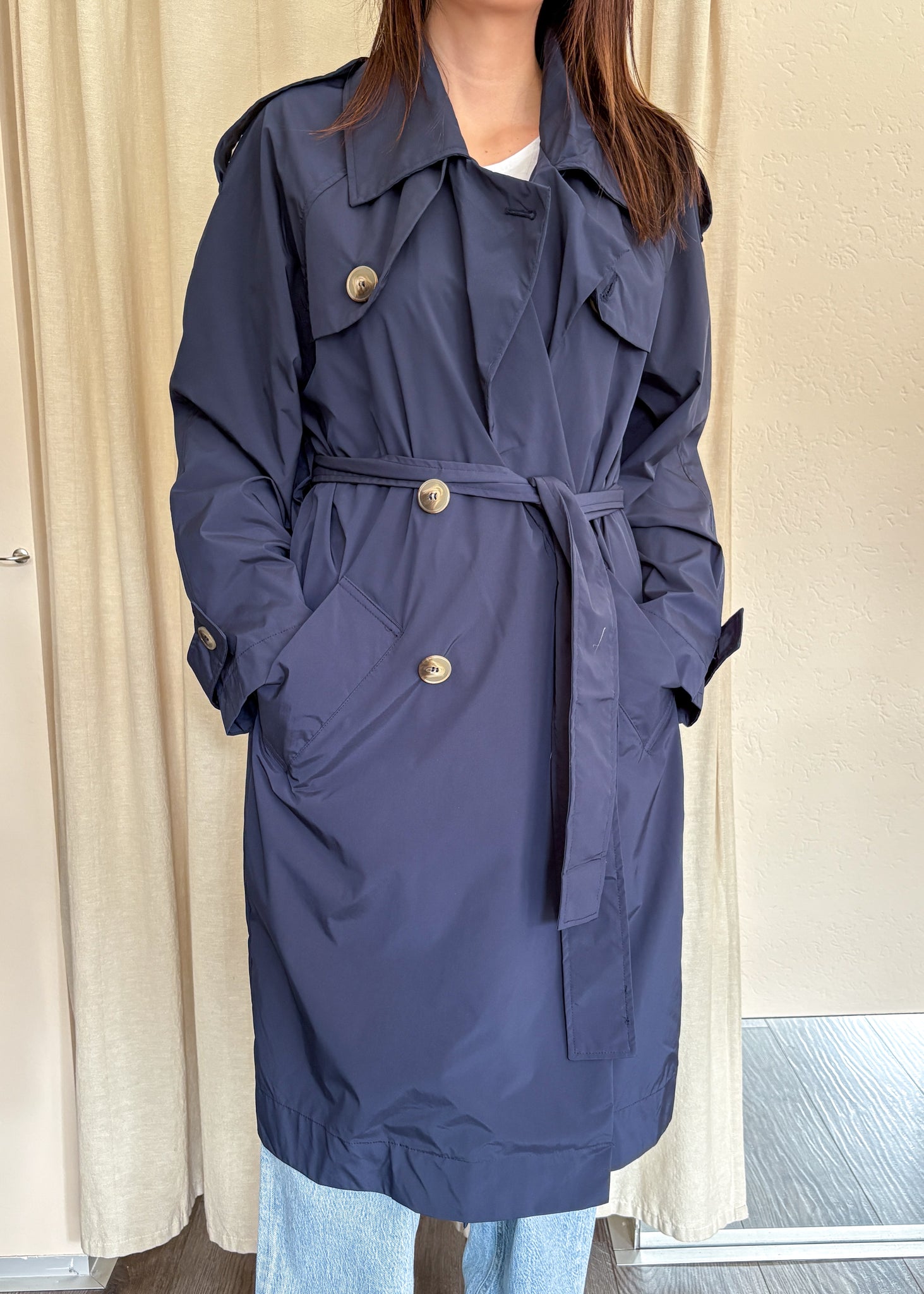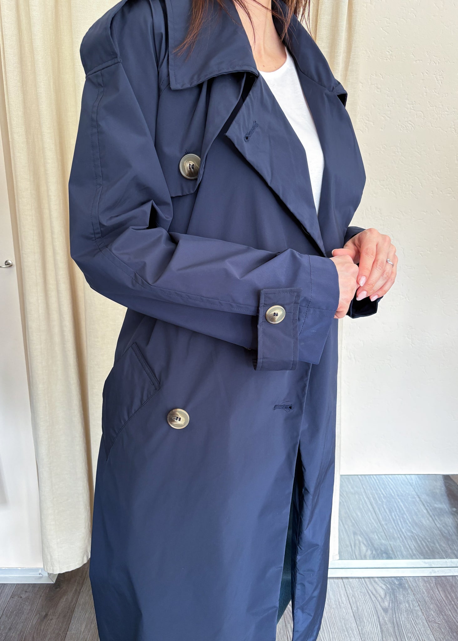 Trench Please in blu notte dalla vestibilità over. Una giacca senza tempo che non passa mai di moda, perfetta con ogni tipo di look. Tessuto tecnico.